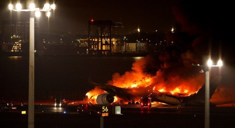 O Airbus A350 da Japan Airlines colidiu com uma aeronave da Guarda Costeira e ficou em chamas. Segundo a companhia aérea, todos que estavam abordo, incluindo os tripulantes, foram salvos.