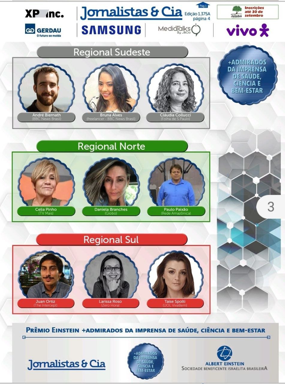 O Amazonas tem dois representantes entre os TOP 3 da Região Norte na 2ª edição do Prêmio Einstein +Admirados da Imprensa de Saúde, Ciência e Bem-Estar, uma parceira entre Jornalistas & Cia, Portal dos Jornalistas e Hospital Israelita Albert Einstein.