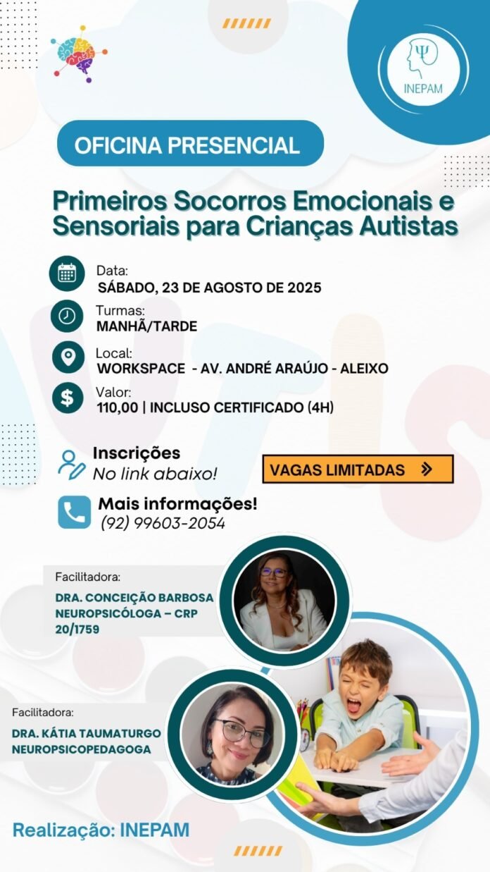 No próximo dia 23 de agosto, o Instituto de Neuropsicologia do Amazonas (INEPAM) realizará a Oficina Presencial “Primeiros Socorros Emocionais e Sensoriais para Crianças Autistas”, um treinamento pioneiro que ensina como agir de forma segura, empática e assertiva diante de crises emocionais ou de sobrecarga sensorial.