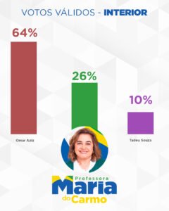 A pesquisa mostra um cenário estimulado com três opções de possíveis candidatos ao Governo do Amazonas em 2026. A Professora Maria do Carmo, mesmo sem nunca ter mandato e enfrentando a máquina pública, já aparece em segundo lugar, com 43% das intenções de votos válidos na capital e 26% no interior do Estado.