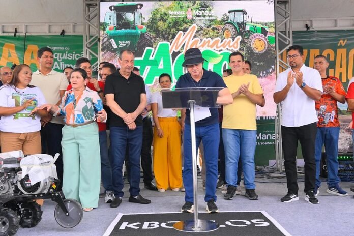 O prefeito de Manaus, David Almeida, conduziu, na manhã desta quinta-feira, 4/9, a solenidade de entrega de equipamentos agrícolas para associações rurais da capital, realizada na alameda Alphaville, parque Amazonino Mendes, bairro Novo Aleixo. A iniciativa integra o programa “Manaus + Agro” e reforça as ações da gestão voltadas ao fortalecimento da agricultura familiar.
