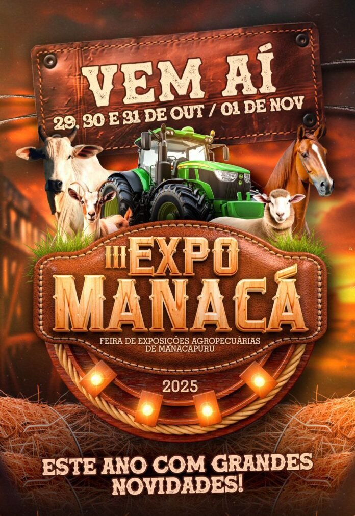 A Prefeitura de Manacapuru anunciou nesta quarta-feira (17) as datas oficiais da 3ª ExpoManacá: Feira de Exposições Agropecuárias de Manacapuru, que acontecerá entre os dias 29 de outubro e 1º de novembro de 2025. O evento, que já se consolidou como um dos maiores do interior do Amazonas, promete este ano trazer novidades e uma programação ainda mais diversificada.