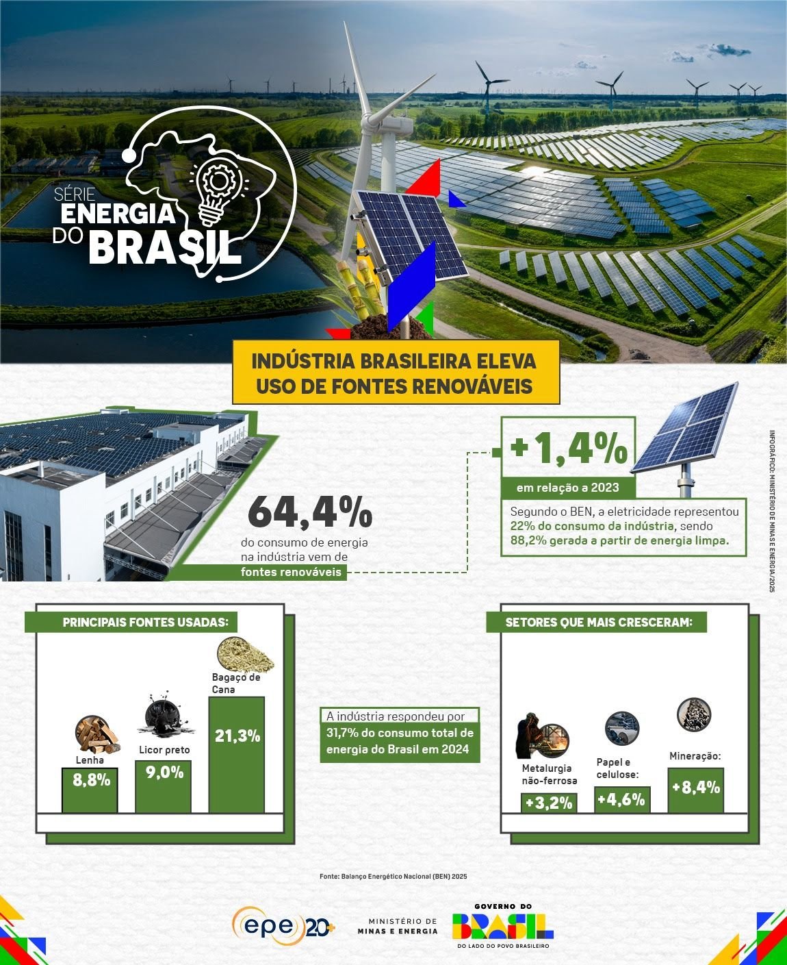 O Brasil tem uma das matrizes energéticas mais limpas do mundo e está cada vez mais apostando em fontes renováveis nos setores que movem a economia. Segundo o Balanço Energético Nacional (BEN) de 2025, a indústria brasileira usou 64,4% dessas fontes em 2024 e 64,7% em 2023 (dado do relatório síntese). Esse resultado mostra como o setor industrial está ganhando destaque na transição para uma energia mais limpa no mundo.
